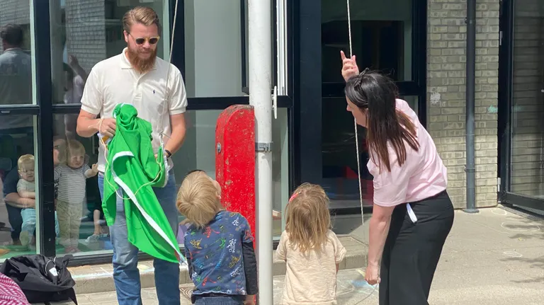 Torsdag den 19. juni kunne Baunegården således fejre den flotte anerkendelse for deres store naturarbejde ved at hejse det officielle Grønne Spirer-flag foran deres matrikel. Her var det borgmester Marianne Bredal og dagtilbudsleder Nikolaj Møller Lykke, der sammen med nogle kyndige minihjælpere fik hejst flaget.